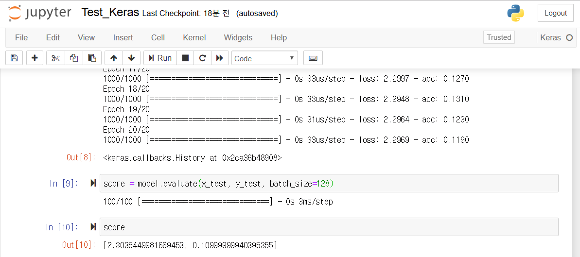 - (https://keras.io/getting-started/sequential-model-guide/) 소스 코드를 참고하여 설치/동작 상태 확인